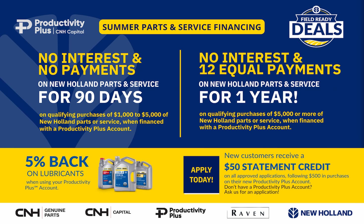 Productivity Plus is the best way to buy Parts or Service now, and pay later. Improve cash flow for your operation and keep your equipment ready for anything.